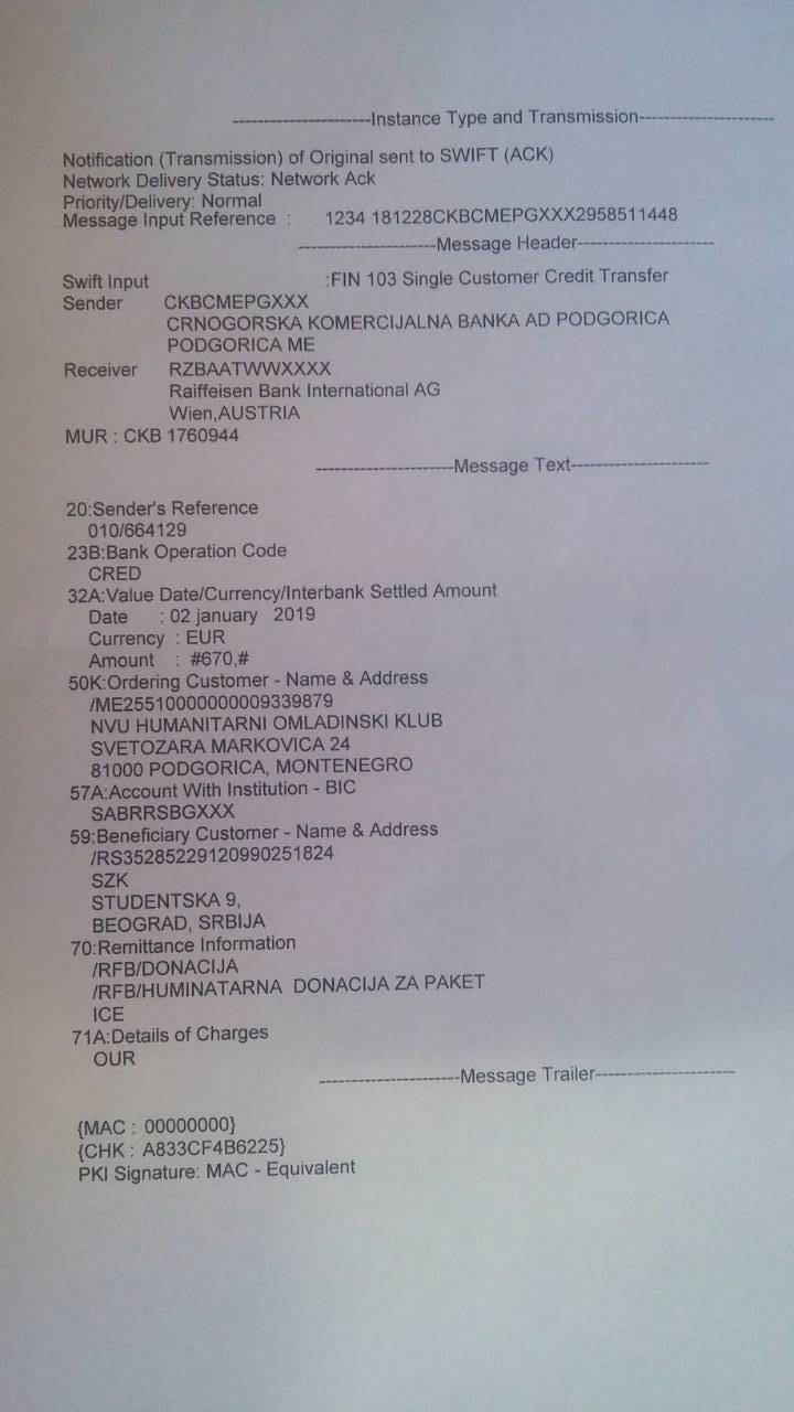 Захваљујући вашим донацијама уплаћена су средства у износу од 670е на рачун хуманитарне организације ”Сви за Космет”, која је уједно и организатор ове акције.