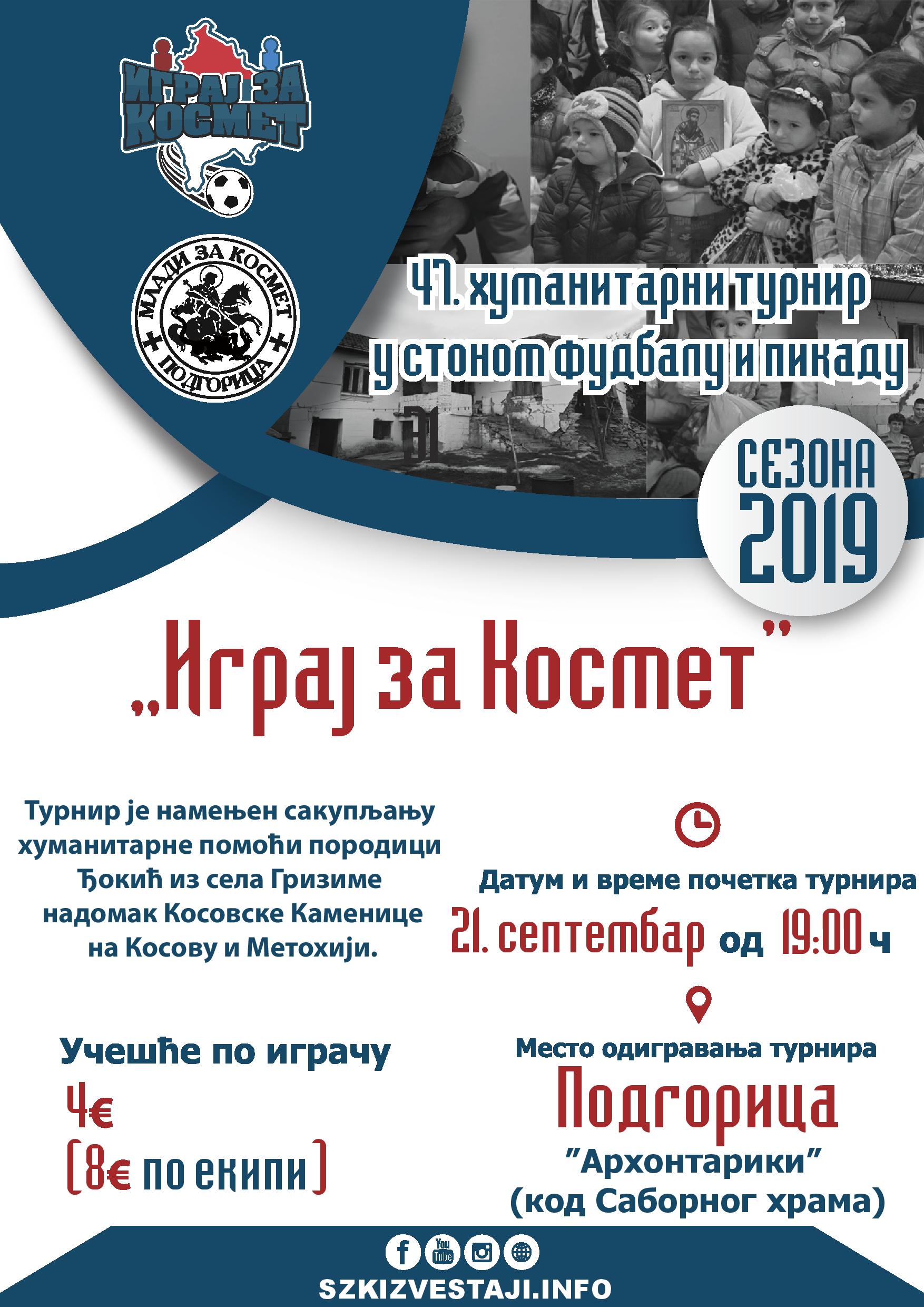 У сарадњи са братском организацијом Сви за Космет из Београда, 21. септембра биће организован хуманитарни турнир у стоном фудбалу и пикаду '' Играј за Космет'' 47. по реду а први пут у Подгорици.