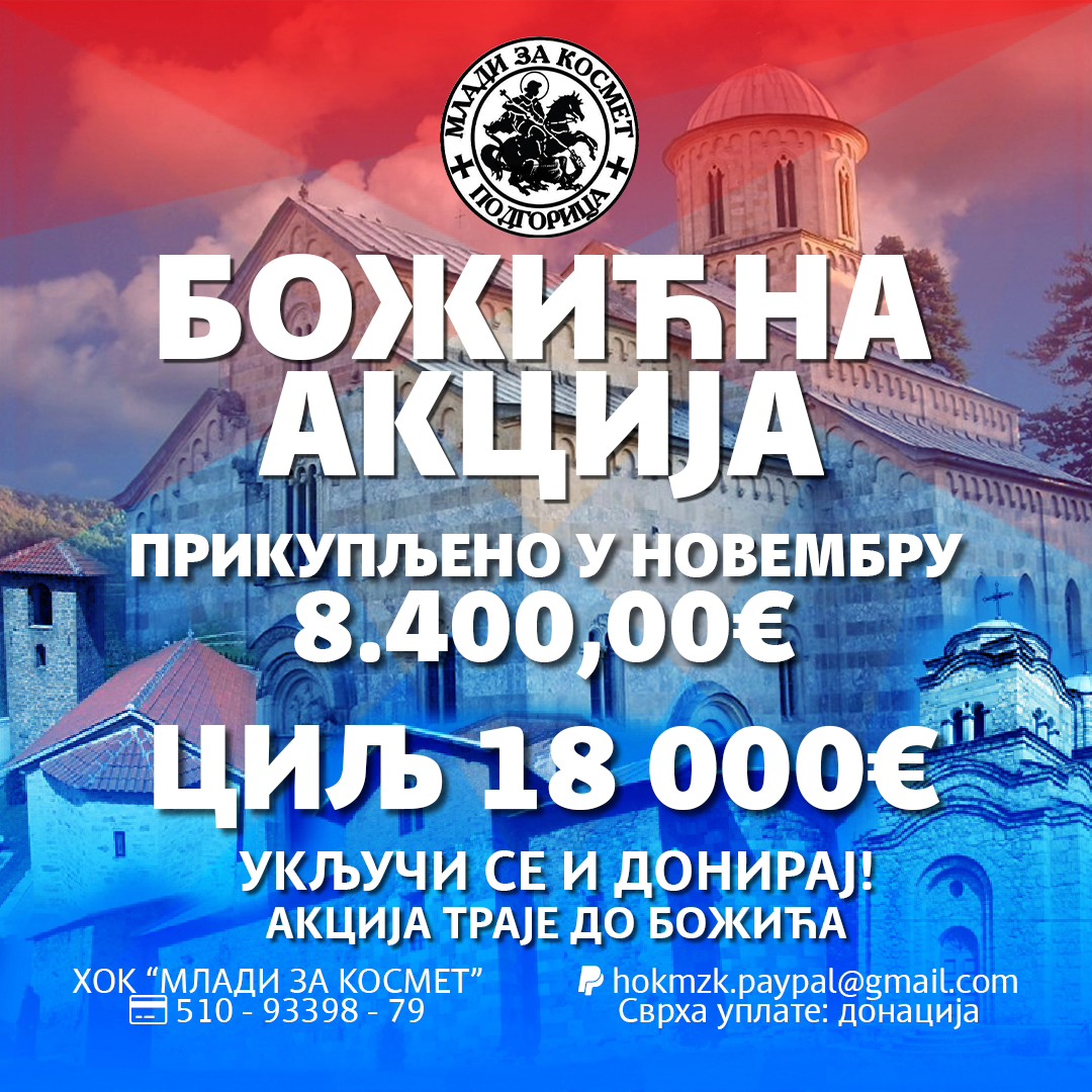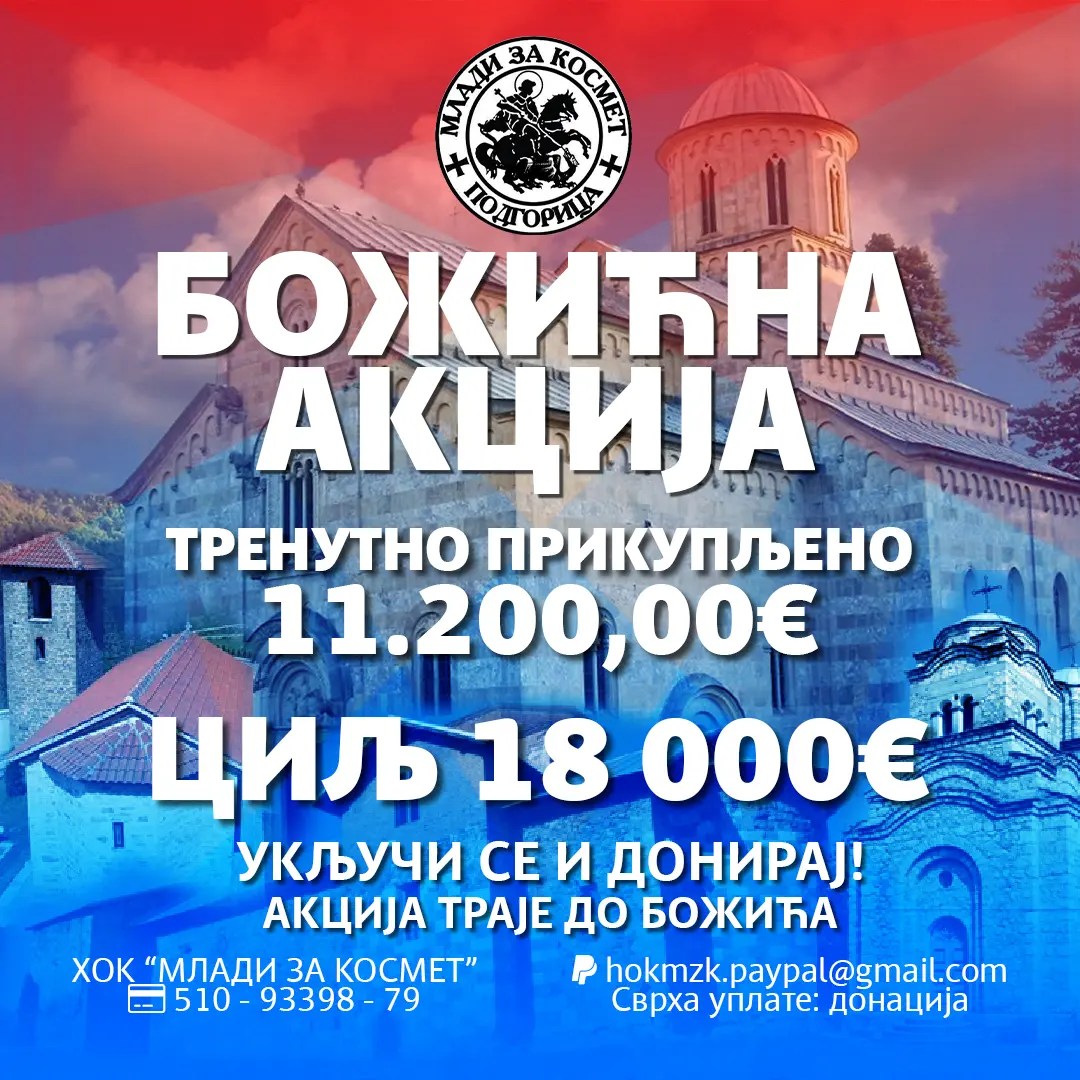 Обавјештавамо вас да смо након другог пресјека стања дошли до цифре од 11200€! Зацртани циљ износи 18000€ и позивамо све да, колико могу, учествују у Божићној акцији и помогну наш народ и светиње на Косову и Метохији.