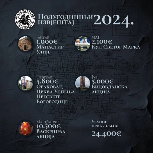 У јануару смо прикупљали средства за манастир Улије, којом приликом је сакупљено 1.000,00 Еур, а фебруар је био намијењен за фрескописање цркве Успења пресвете Богородице у Ораховцу, па смо овај пројекат помогли са 5.800,00 Еур.